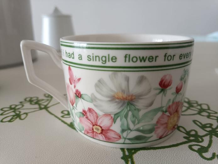 Prendo la tazza che Yanzi mi ha consegnato il primo giorno e la riempio di acqua per la notte. Mi accorgo solo adesso che c’è una frase in inglese: If I had a single flower for every time I think about you, I could walk forever in my garden.